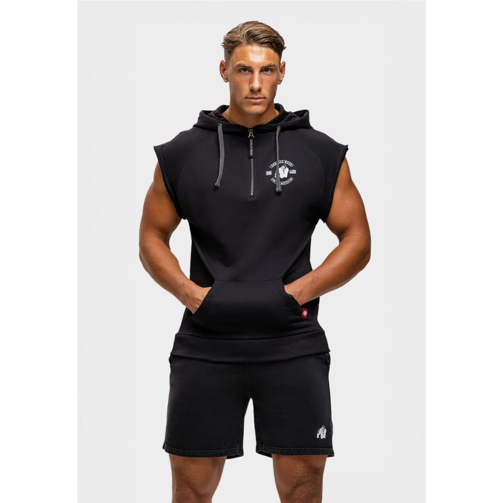 Тренируйся упорно. Живи смело. Безрукавка Huntley Sleeveless Hoodie — это идеальный вариант для тренировок в спортзале, где сочетаются функциональность и стиль. Независимо от того, тренируешь ли ты плечи или разминаешься, эта безрукавка с облегающим кроем обеспечивает полную свободу движений и дышащий комфорт. Ткань из хлопковой смеси мягкая на ощупь, но прочная, а капюшон и карманы-кенгуру добавляют функциональности. С ярким логотипом Gorilla Wear на груди вы не просто тренируетесь — вы демонстрируете свою целеустремленность. Никаких оправданий. Никаких ограничений. Только прогресс.